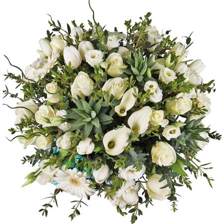 Since the ancient time, white color symbolized purity, sincerity, holiness and peace. It is common to offer compositions in these shades in the case of light and important occasions. For example, you can choose the arrangement «Tiffany» for the name day, Anniversary, Wedding or Mother’s Day. It will definitely help you to make a pleasant surprise for a woman and emphasize the importance of her tenderness and femininity.
